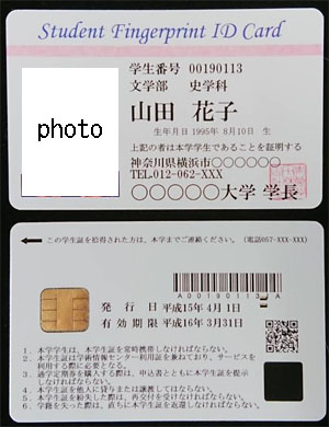 「指紋認証付き学生証」および「指紋認証機能搭載ICカード」はマイコンチップ、指紋センサー、LEDを内蔵し、指紋センサーから読み取られた指紋情報と事前にカード内部に記憶した指紋情報をICカード内で照合処理を完結するオンカードマッチングが可能であり、厚さ0.76mm、指紋照合時間1秒の性能を持ち、ISO7810、7816に準拠したカードです。ICカードです。